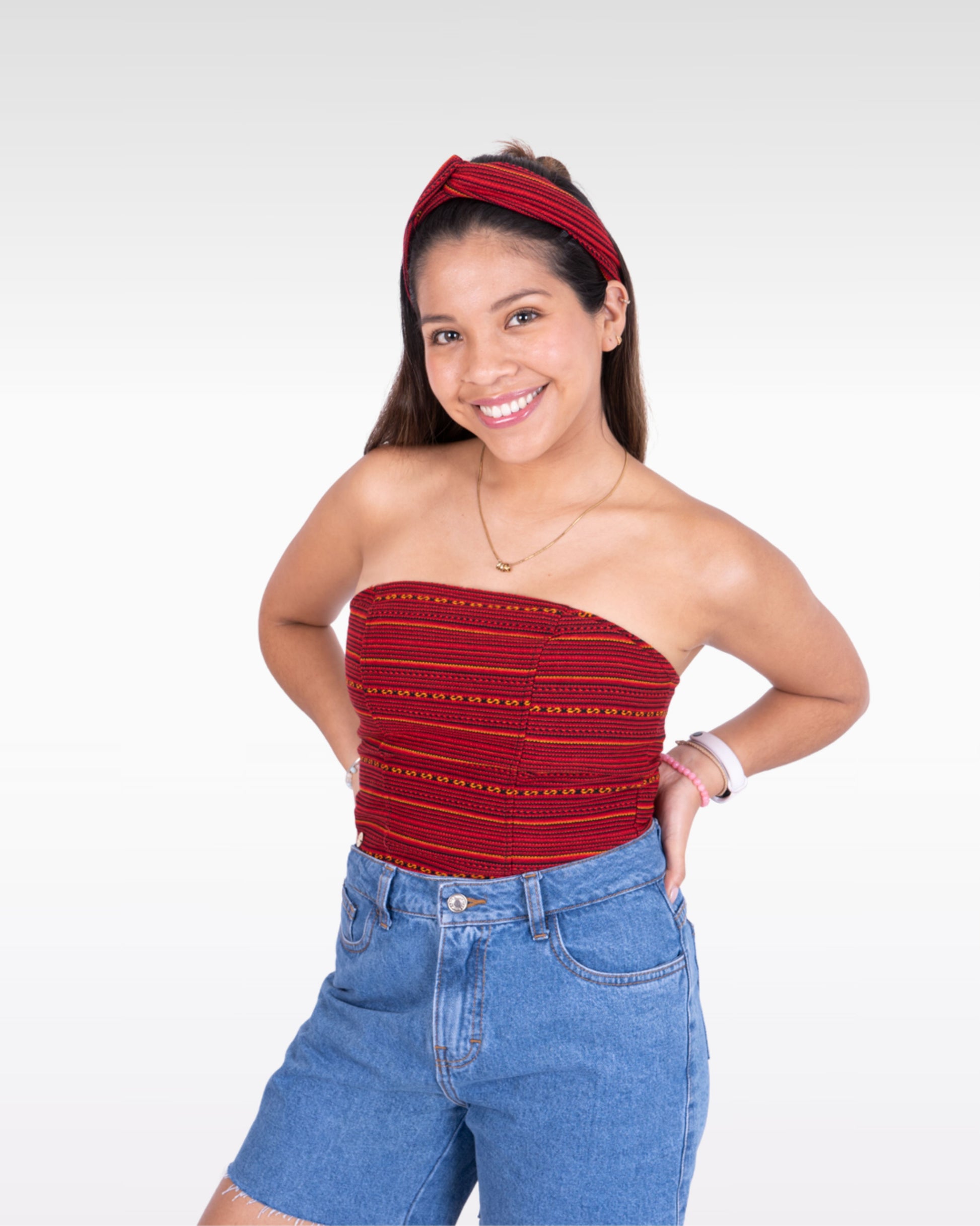 Top strapless de lliclla (telar andino) en color rojo, siéntete cómoda al usarlo porque tiene un pasador graduable en la parte trasera.