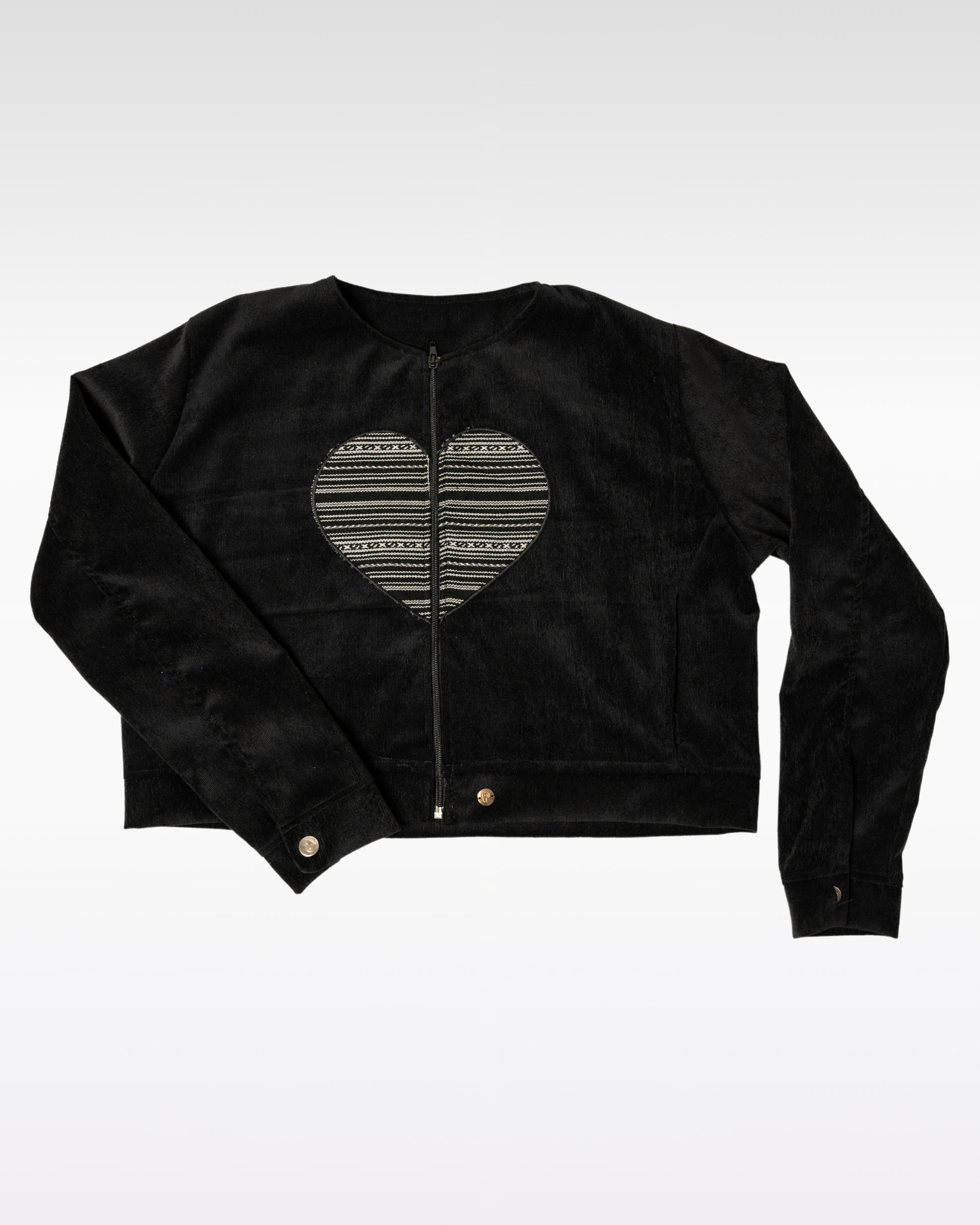 Consigue la casaca de corduroy en color negro con un corazón en telar lliclla en el medio.