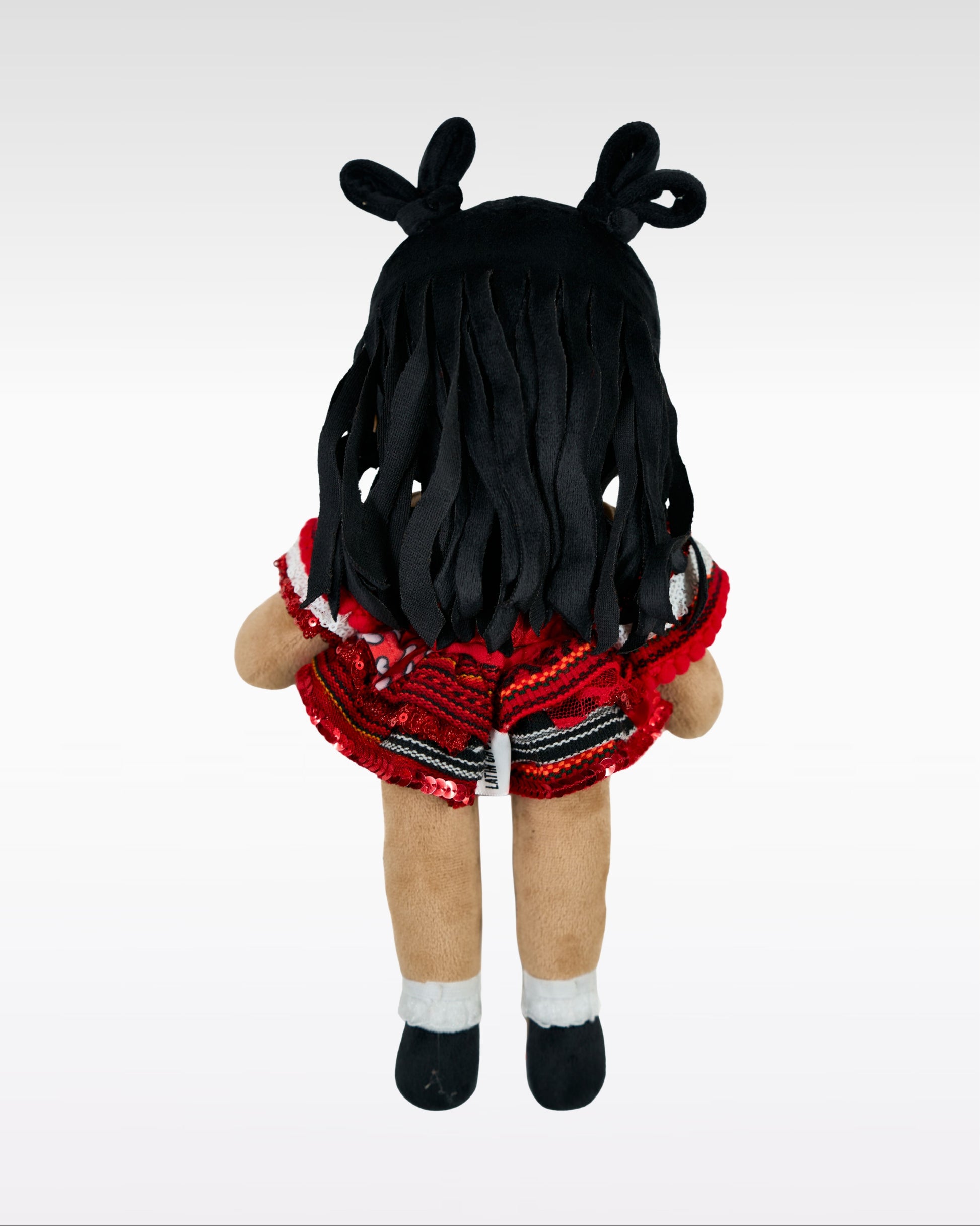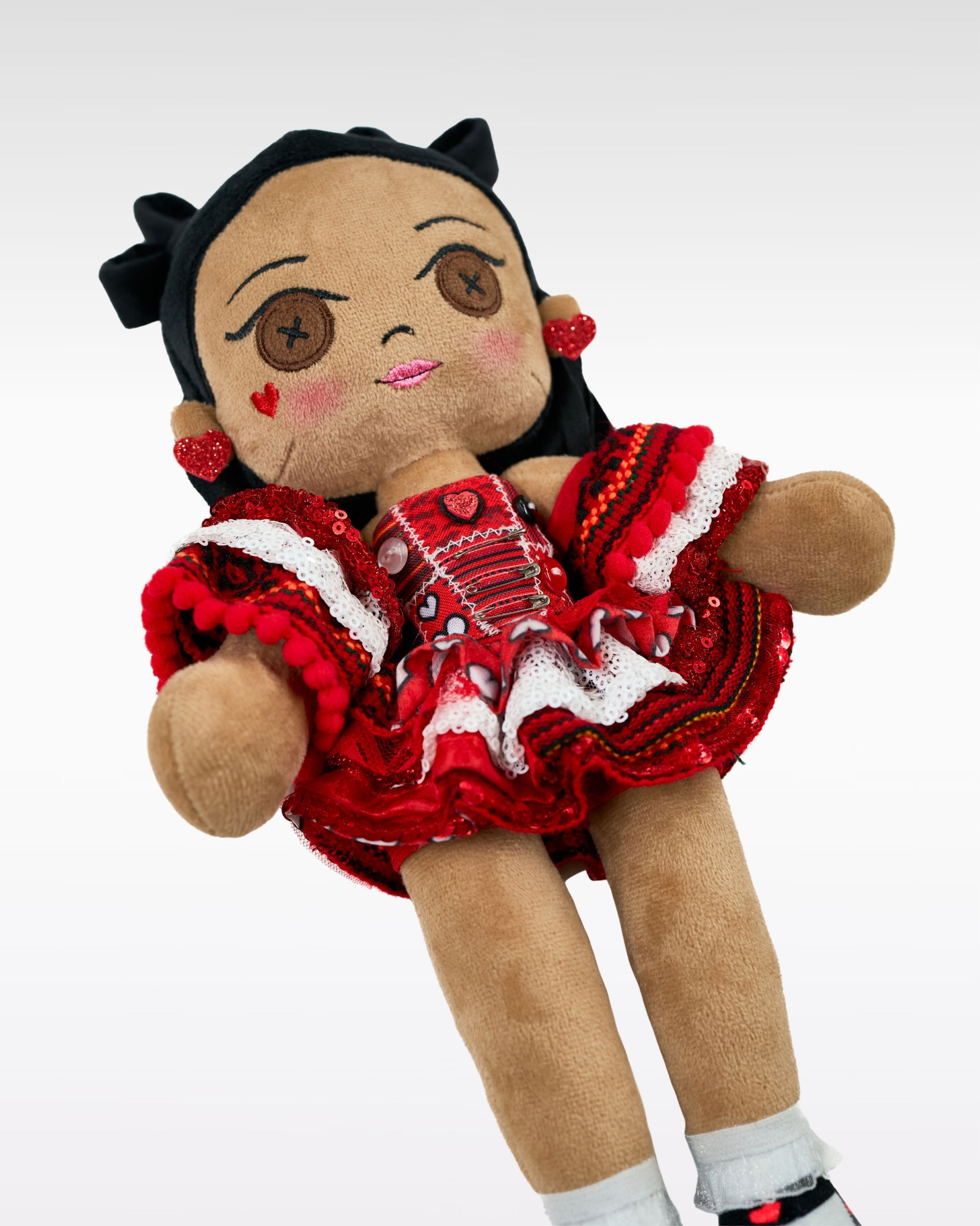 La muñeca LATINCHOLA Edición Victoria es una pieza artesanal hecha a mano, inspirada en la canción “Victoria” de Milena Warthon.